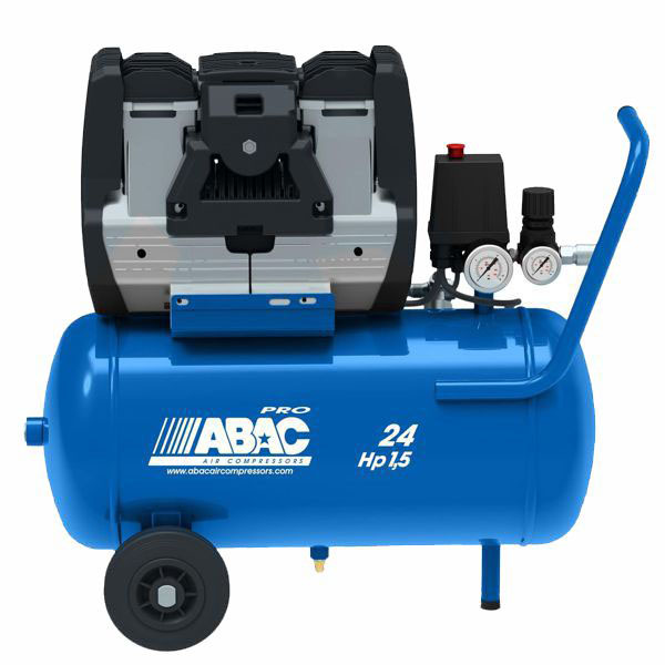 HP 1,5 - kW 1,10 - Bar 9 - l/min 195 - Giri 1420 Peso kg 24 - Dimensioni 616x300 h 574 Coassiale oiless - Serbatoio l 24 Regolatore pressione - 2 manometri Valvola spurgo condensa Silenzioso: livello rumore 59dBA